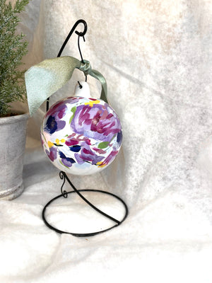 4" diameter porcelain ornament with original handpainted design.  Comes with ornament stand.  Gloss glaze protective coat.